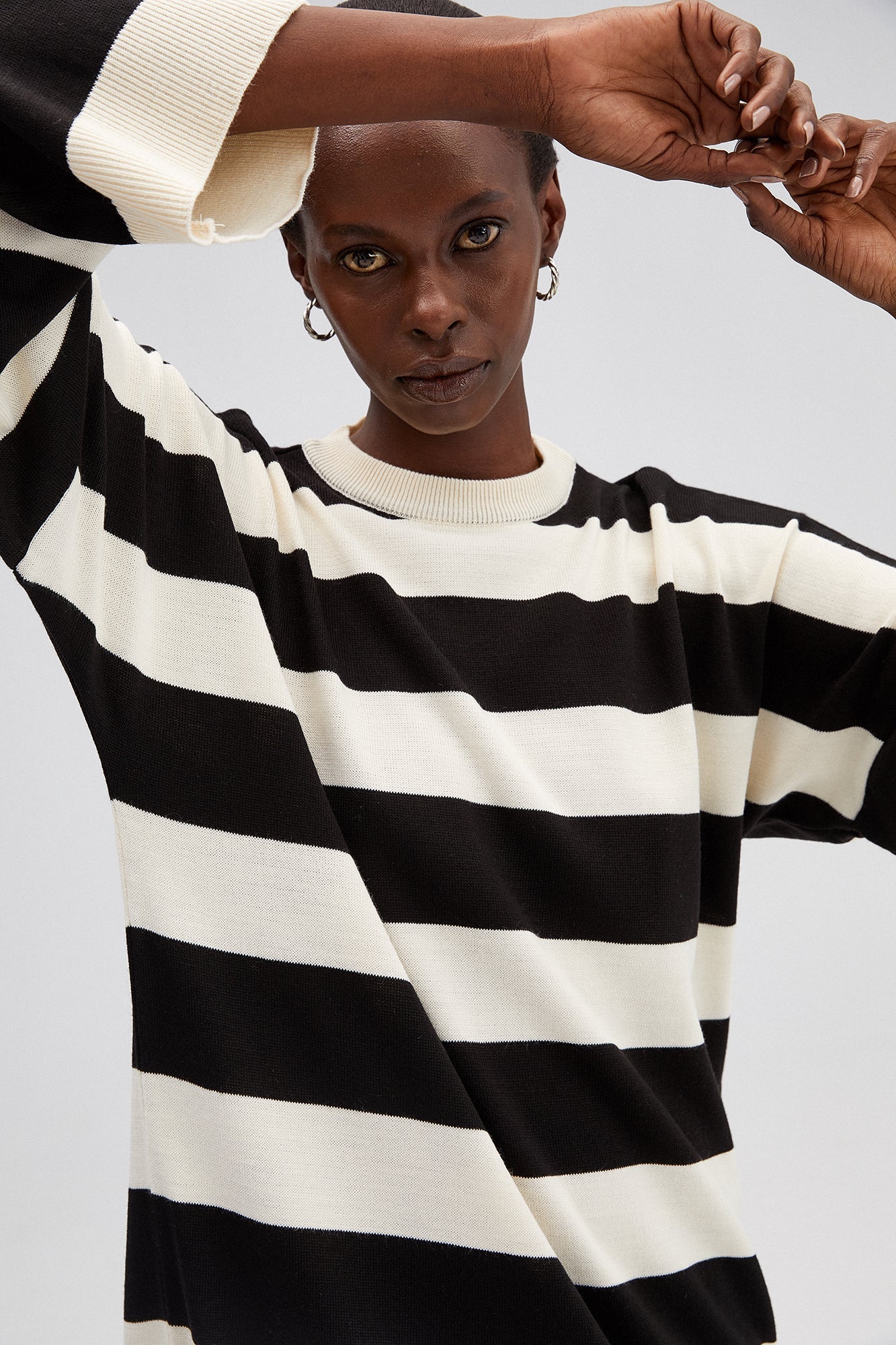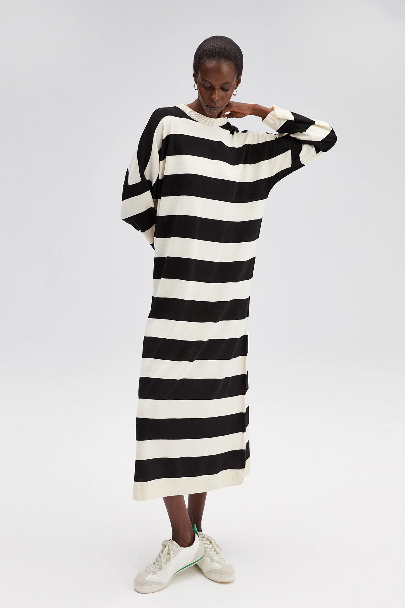 Maak een stijlvol statement met deze opvallende gestreepte oversized midi jurk. Met een indrukwekkende lengte van 128 cm en een borstomvang van 148 cm biedt deze jurk een comfortabele en ruime pasvorm. De mouwlengte van 36 cm voegt een speelse touch toe aan het ontwerp, terwijl de ruime snit ideaal is voor een relaxte en toch modieuze look. Het model, met een hoogte van 177 cm en maat S, toont hoe de jurk soepel valt voor een moeiteloze uitstraling. Vervaardigd uit 100% acryl, deze jurk is zacht, duurzaam en gemakkelijk te onderhouden, waardoor het een perfecte keuze is voor zowel dagelijks gebruik als bijzondere gelegenheden.