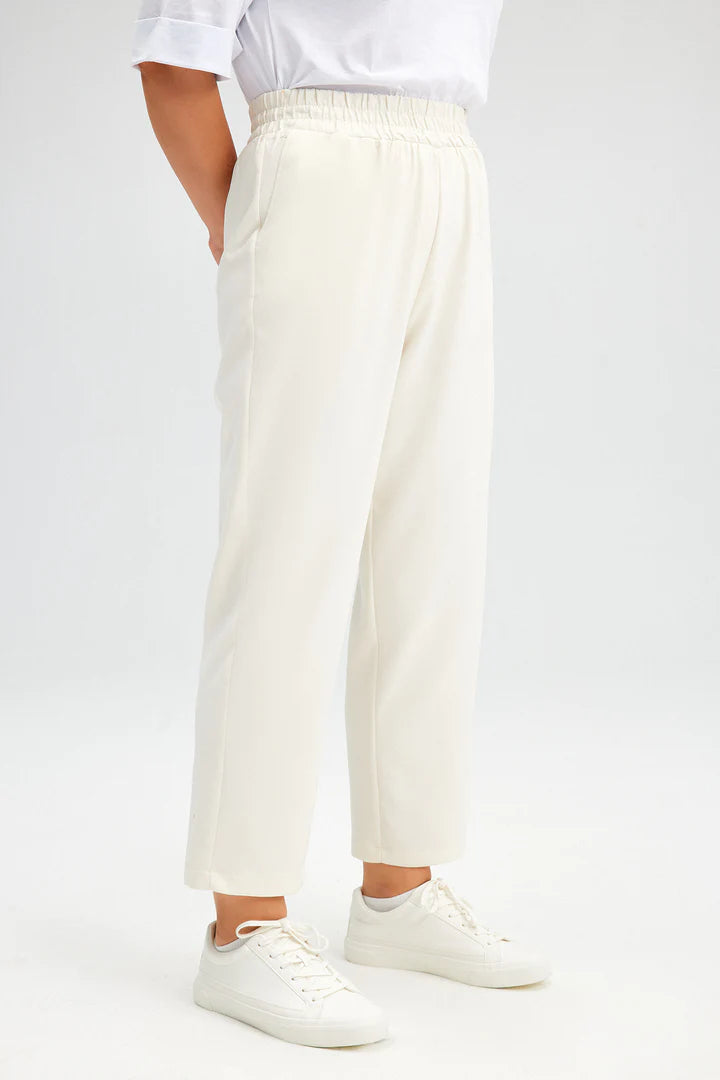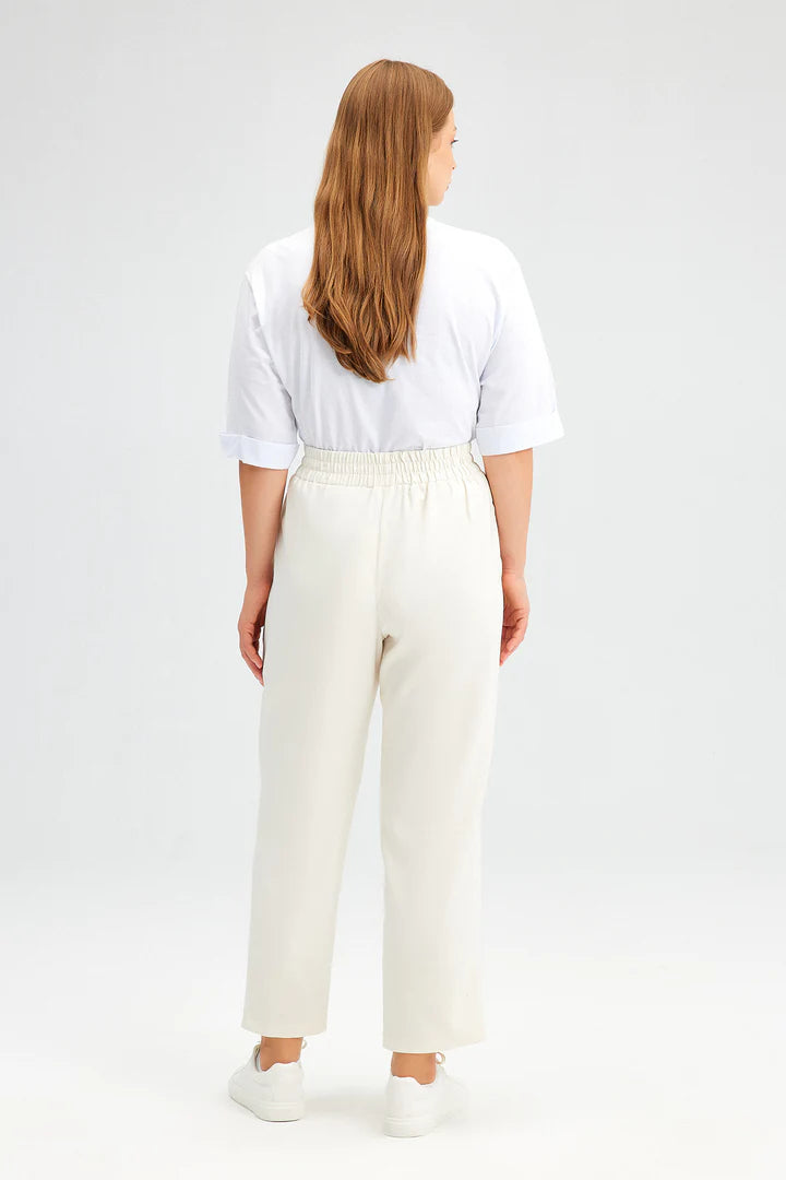 Of je nu naar kantoor gaat, een dagje gaat winkelen of een avondje uit, deze broek van crêpe met elastische taille is een veelzijdig kledingstuk dat je eindeloos kunt combineren. Bestel hem nu op onze website en voeg een vleugje stijl en comfort toe aan je garderobe.