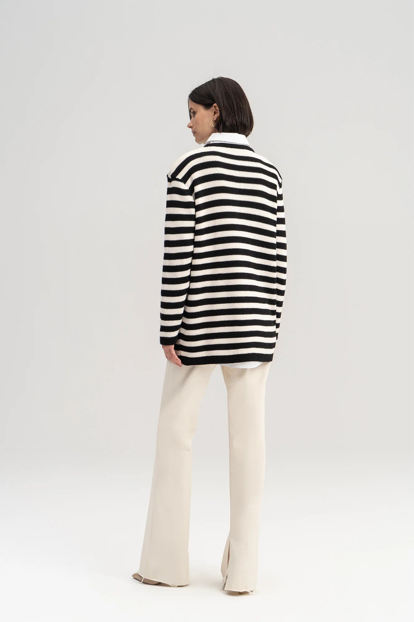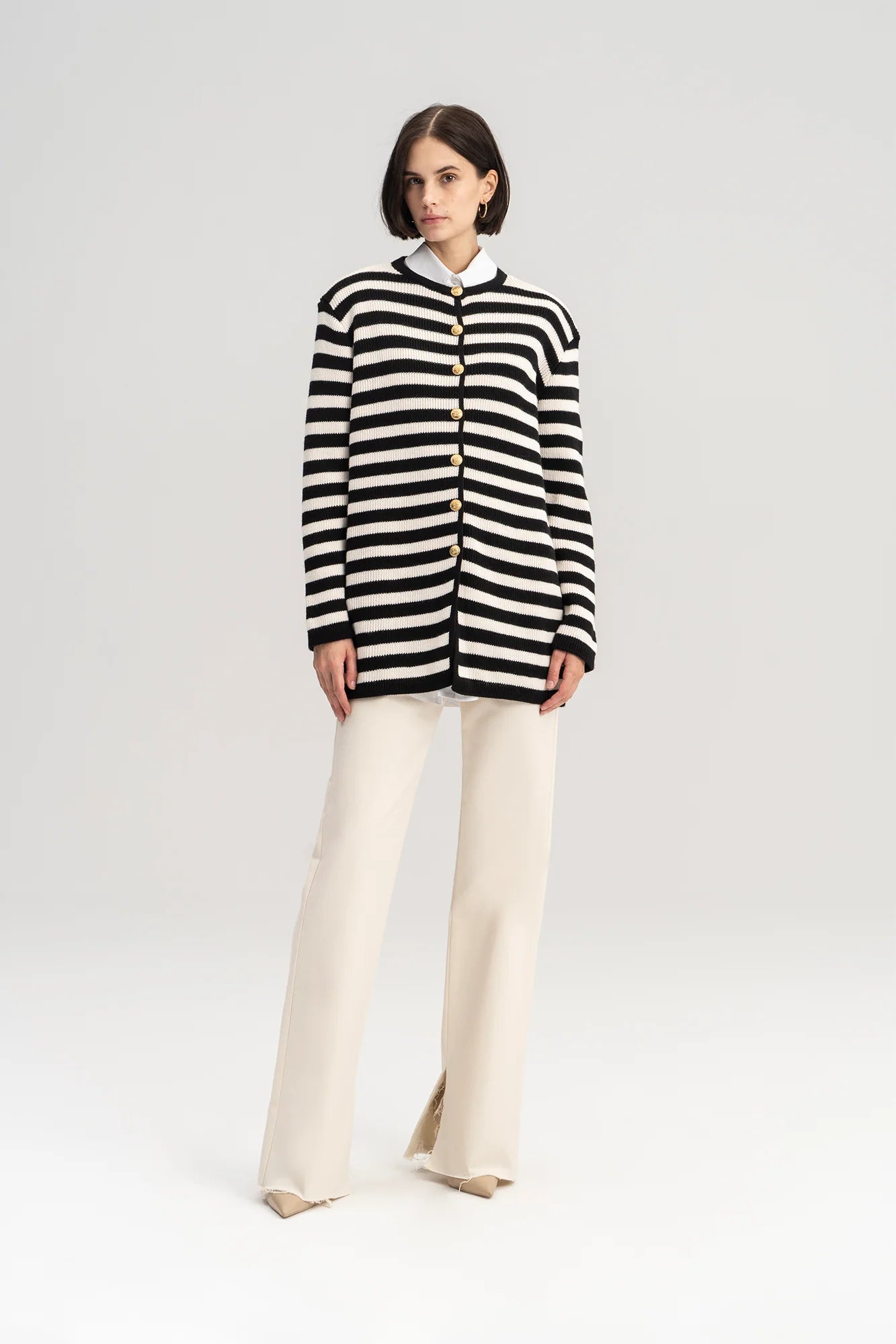 Deze modieuze cardigan combineert klassieke strepen met een trendy twist dankzij de schitterende gouden knopen. Met een lengte van 76 cm, een borstomvang van 108 cm, en mouwlengte van 55...
